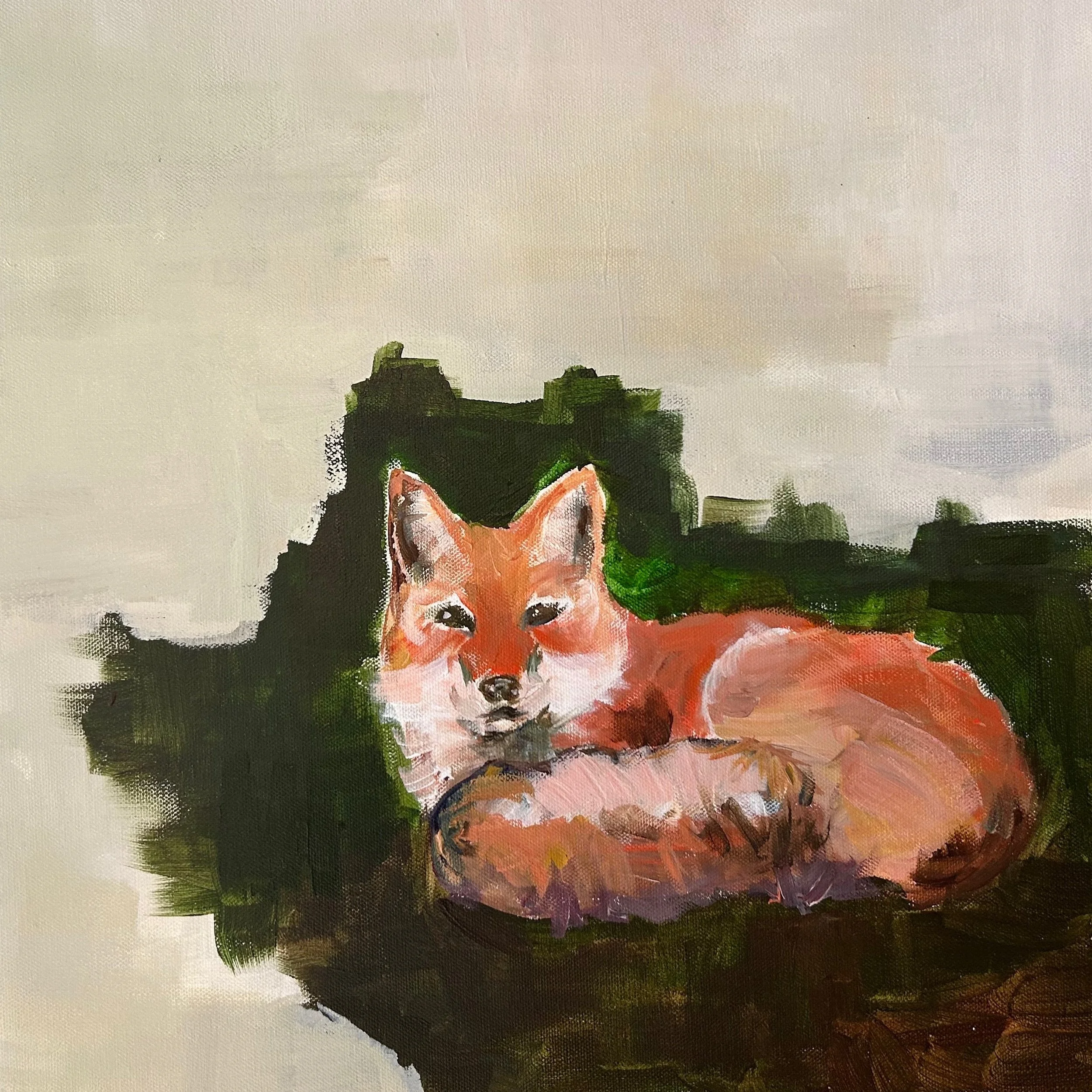 The client wanted a painting of a fox to as a wink to her tongue in cheek use of fox hunt wallpaper in her farmhouse dining room. Julia chose a fox in a resting pose. He knows he is safe during the hunt.